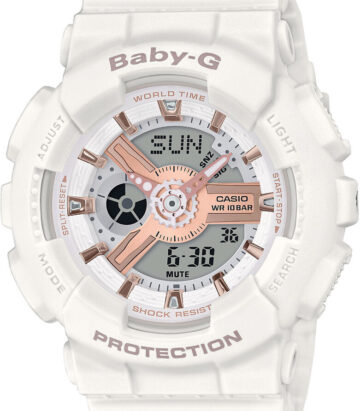 Casio Baby-G BA-110RG-4AER – це надійний та ударостійкий годинник із кварцовим механізмом, який живиться від батарейок. Корпус із пластику вкритий стильним покриттям ###DISPLAY####, а рожевий ремінець із високоякісного силікону легкий і міцний. Захист циферблата ###DISPLAY### забезпечується мінеральним склом. Вони мають водонепроникність до 100 метрів, тому ідеально підходять для плавання і фрідайвінгу.