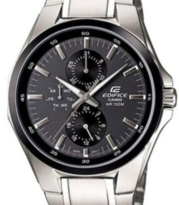 Модель чоловічого годинника EF-562D-1A колекції Casio Edifice має корпус круглої форми виконаний з нержавіючої сталі, з циферблатом чорного кольору та індексами захищеним мінеральним склом. Сталевий браслет, хронограф кварцовий. У цьому годиннику можна плавати і пірнати на невелику глибину до 3-5 метрів.