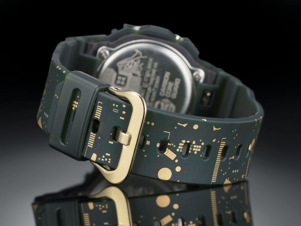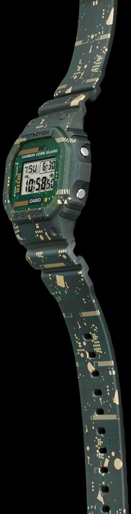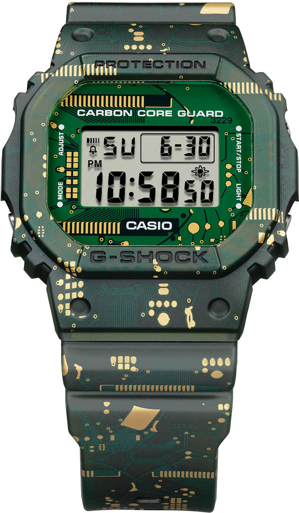 Цей багатофункціональний годинник ідеально підходить активним молодим людям, які люблять займатися спортом. Ви отримаєте модель годинника серії 5600 з протиударним корпусом, який має внутрішній модуль з карбонових волокон, більш міцний і легкий. Корпус прикрашений хитромудрими візерунками електронних друкованих плат. Електролюмінесцентне підсвічування освітлює весь циферблат, а також має світлову індикацію сигналу. Колір підсвічування: синьо-зелений. Годинники підтримують 12-ти і 24-х годинний формат часу, секундомір з різними точності показань, SPLIT-хронограф, таймер зворотного відліку і щоденні, щомісячні і певні дати сигналів. Ремінець із полімерного матеріалу, прикрашений кольоровим принтом, підкреслить ваш стиль.