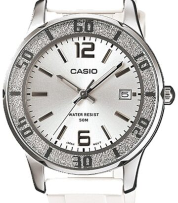 Корпус виконаний із високоякісної нержавіючої сталі. Безель із PVD покриттям білого кольору. Білий каучуковий ремінець. Колір циферблату – білий. Індикація – арабські цифри та мітки. На стрілках люмінесцентне покриття, що забезпечує тривале свічення у темряві. Застібка ремінця – пряжка.